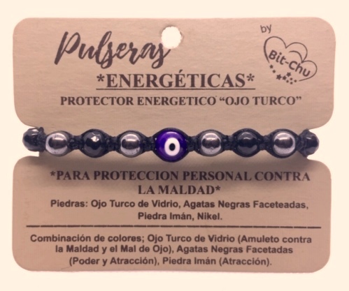 Pulsera Energetica para Protector Personal " Ojo Turco " .Combinación de Piedras: Ojo turco de Vidrio ( Amuleto contra la Maldad y el mal de ojo ), Ágatas negras facetadas ( Poder y Protección ) y Piedra Imán Atracción ( Acerina ) y separador Nikel * PARA PROTECCIÓN PERSONAL CONTRA LA MALDAD *